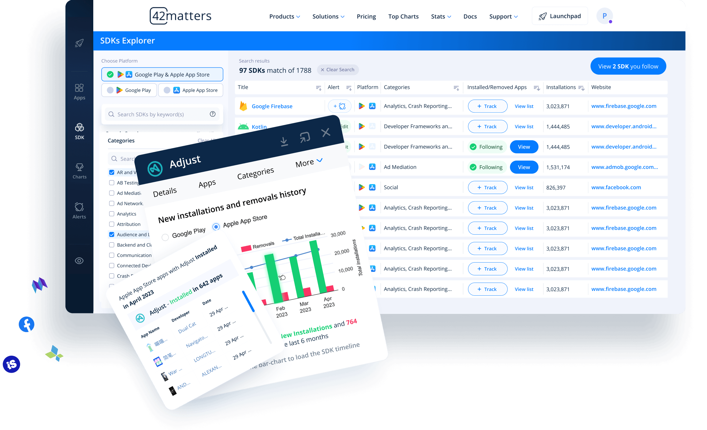 See how many apps integrate specific SDKs, how many times these SDKs have been downloaded, developer details, similar SDKs, and more.